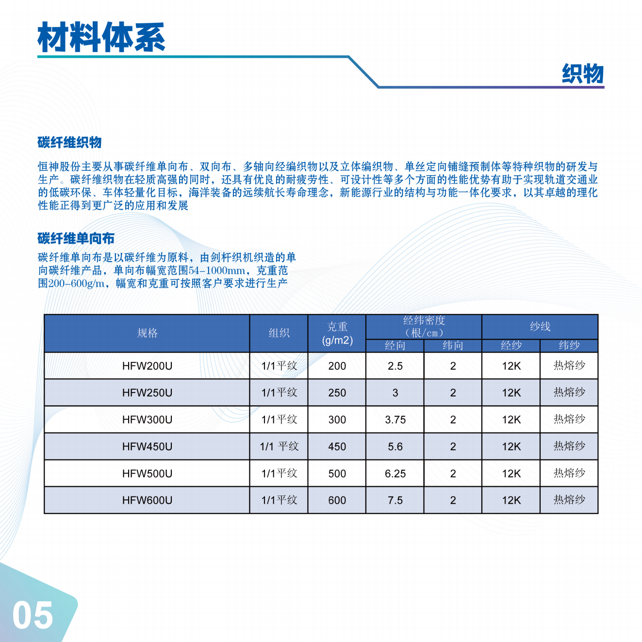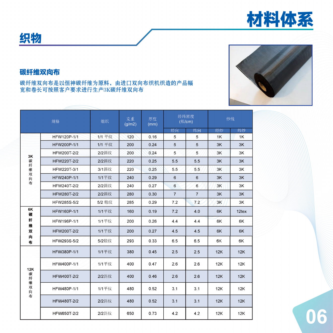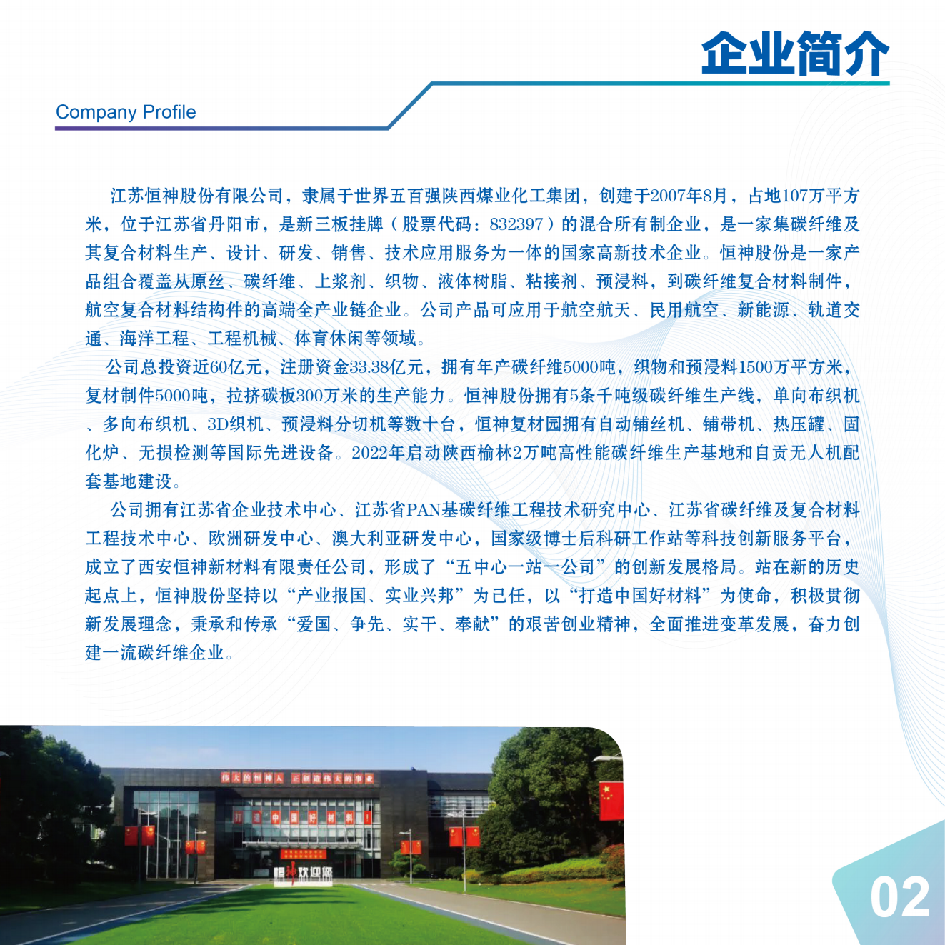 九体育在线登录官网,创建于20078月,占地107万平方米,位于江苏省丹阳市,新三板挂牌(股票代码:832397),是一家集碳纤维及其复合材料生产、设计、研发、销售、技术应用服务为一体的国家高新技术企业,隶属于世界五百强陕西煤业化工集团。产品组合覆盖从原丝、碳纤维、上浆剂、织物、液体树脂、粘接剂、预浸料,碳纤维复合材料制件,航空复合材料结构件的高端全产业链企业。公司产品可应用于航空航天、民用航空、新能源、轨道交通、海洋工程、工程机械、体育休闲等领域。产品型号包括高强碳纤维如:HF20系列(T300级)、HF30系列(T700级)、HF40系列(T800级)、HF50系列(T1000级)及高强高模HM系列。产品规格包括:1K3K6K12K24K50K 等。